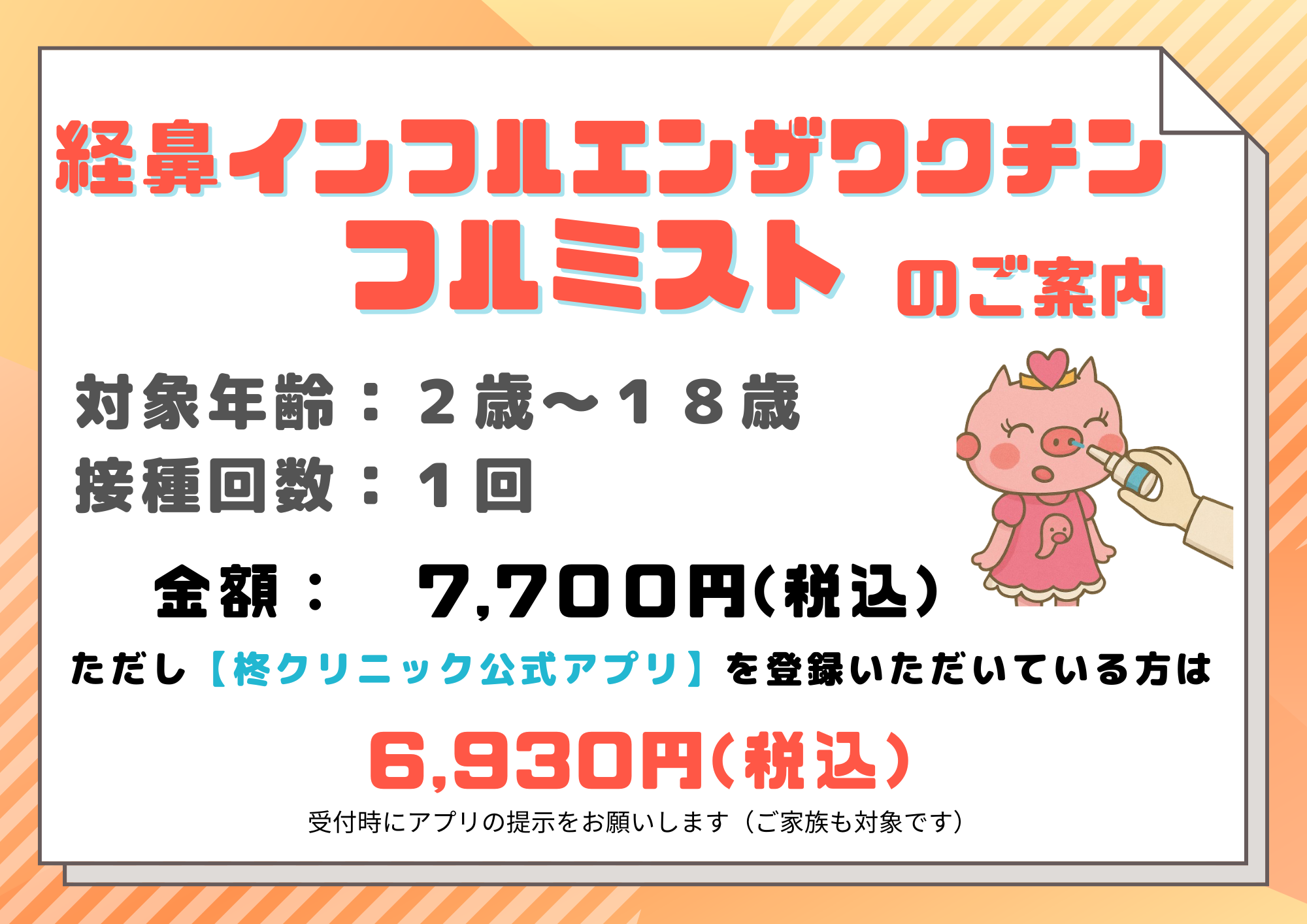 今年度は通常ワクチンに加え、経鼻インフルエンザワクチン【フルミスト】も実施します!